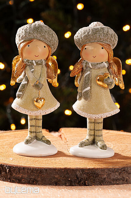 Deux anges coiffés d'un béret en forme de gland. La figurine féerique est en réalité une poupée aux couettes, tenant un cœur entre ses mains. Sa robe, ornée de dentelle et de paillettes, présente des ailes et un cœur dorés. Nous proposons ces anges en version mixte : l'un porte un cœur sur sa poitrine, l'autre un cœur suspendu à une ficelle qui descend le long de sa robe. Souriants, ils évoquent l'hiver et l'esprit de Noël.