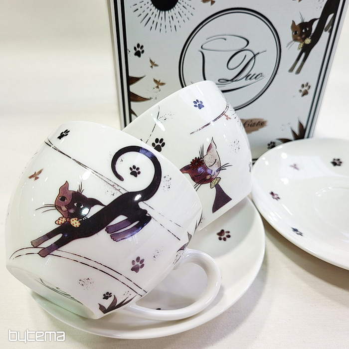 Deux tasses de 280 ml et deux soucoupes sont en porcelaine. L'ensemble est présenté dans une boîte en carton imprimée.