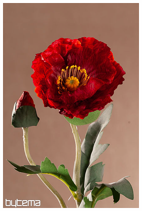 Un pavot à fleur rouge et bouton unique. Plusieurs feuilles ornent sa tige de 69 cm de long. Grâce à sa transformation, on pourrait facilement le confondre avec un vrai pavot poussant dans les prairies et les champs.