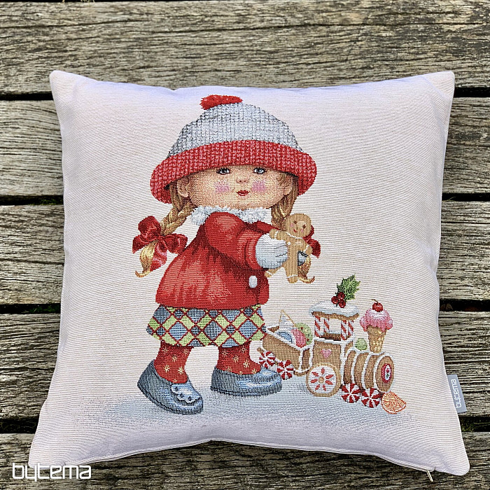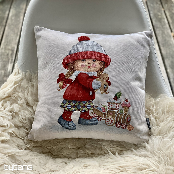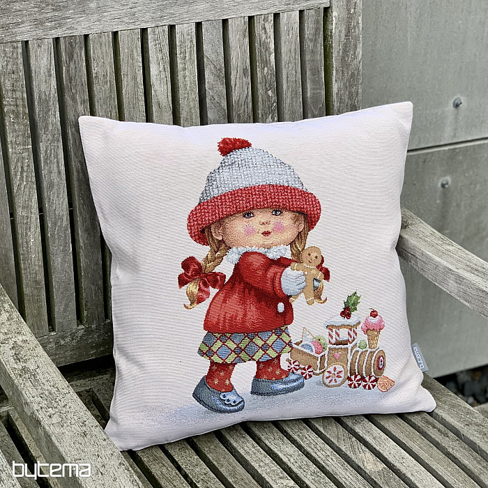 Le coussin décoratif en tapisserie au motif hivernal d'une FILLE avec un jouet est tellement magique.