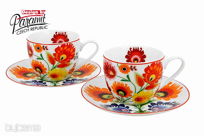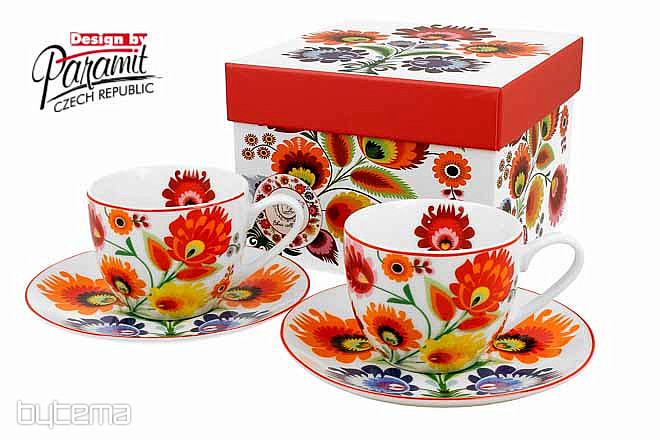 Deux tasses et soucoupes sont présentées dans un joli coffret cadeau.