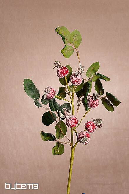 Décoration hivernale. Une branche de 46 cm de long, ornée de sept gros cynorrhodons et de nombreuses feuilles, est recouverte de neige et du plus bel effet.