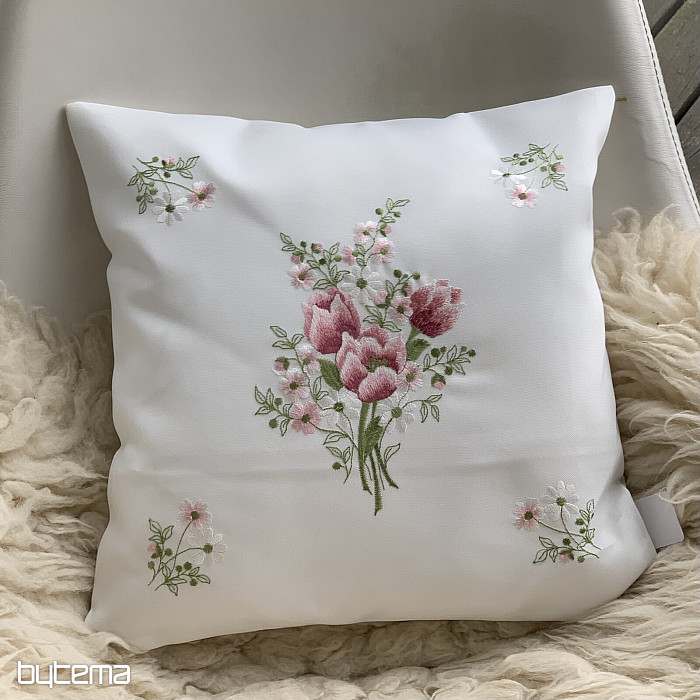 Housse décorative délicatement brodée, ornée d'un bouquet de tulipes roses.