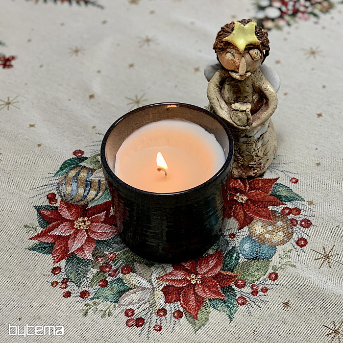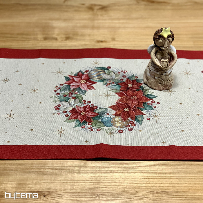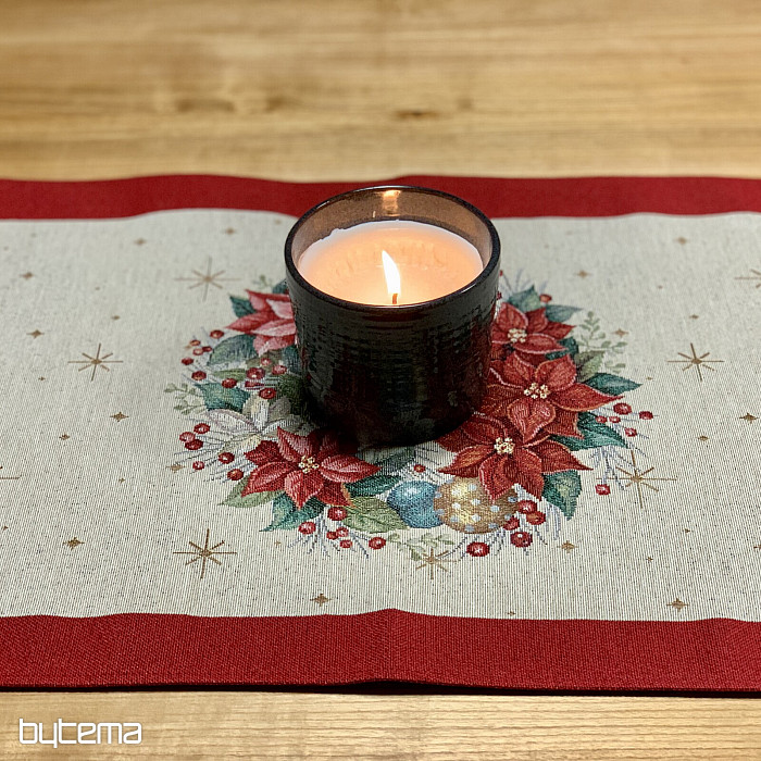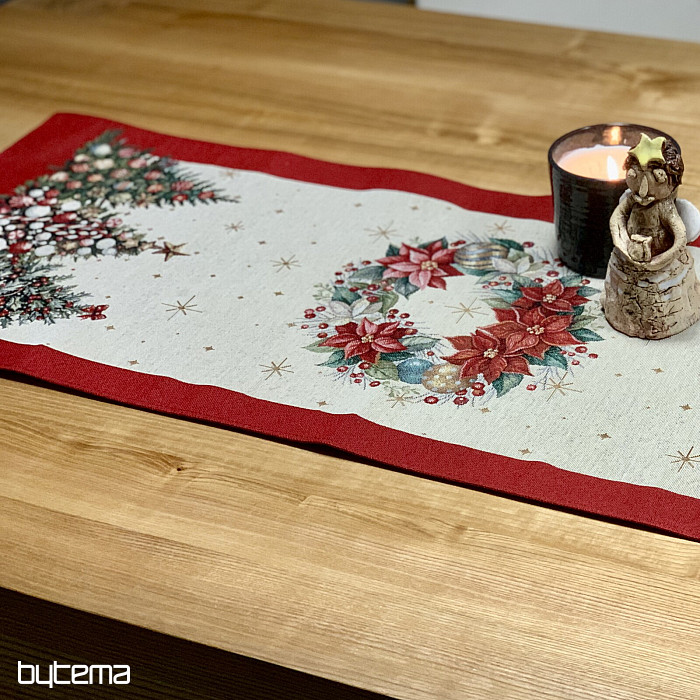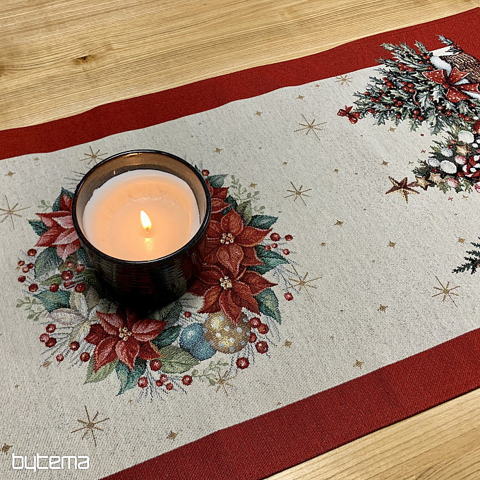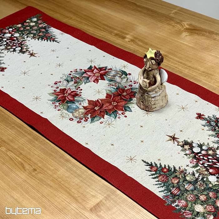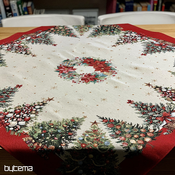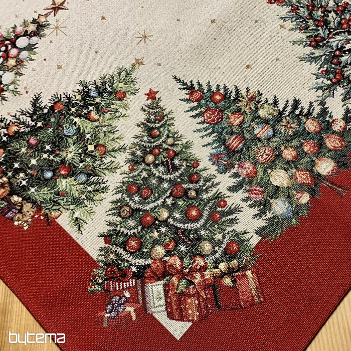 Une nappe et un foulard en tapisserie avec un motif de sapins de Noël décorés évoqueront une atmosphère de Noël féerique dans votre maison.