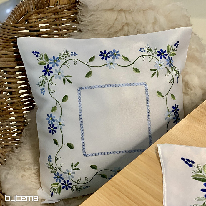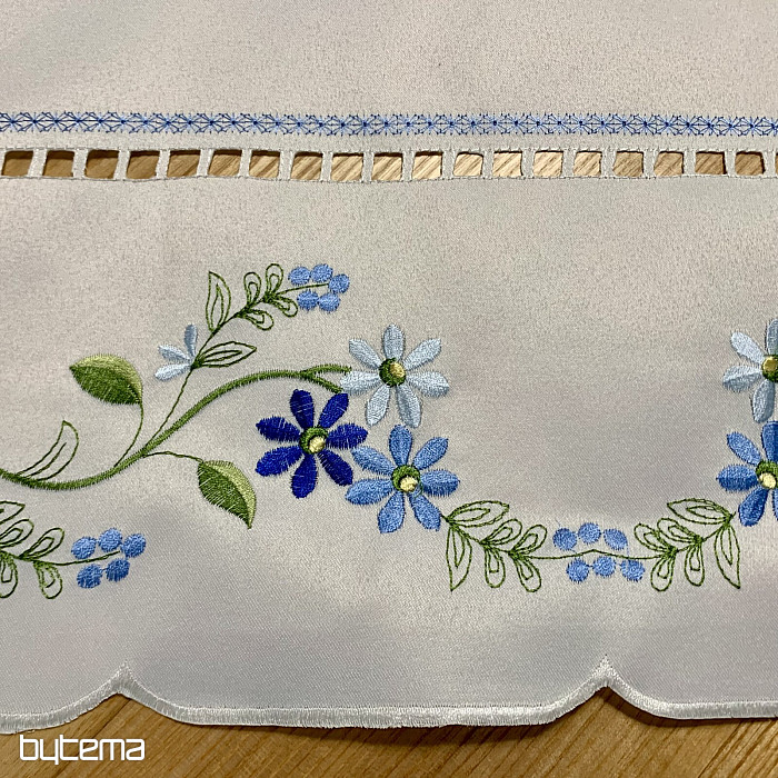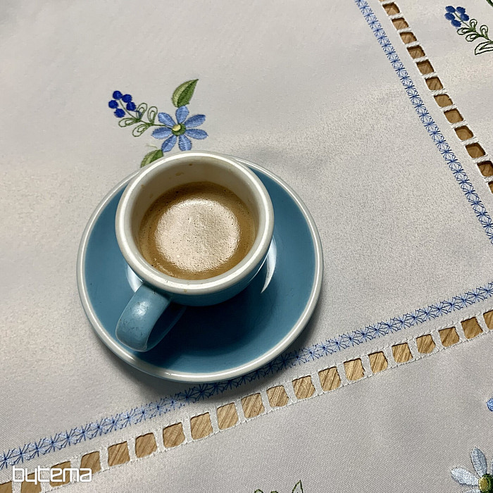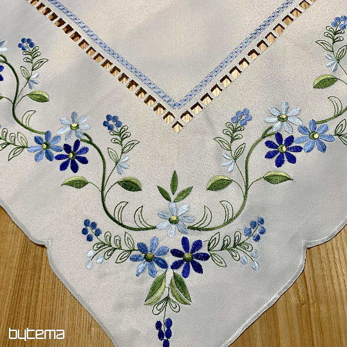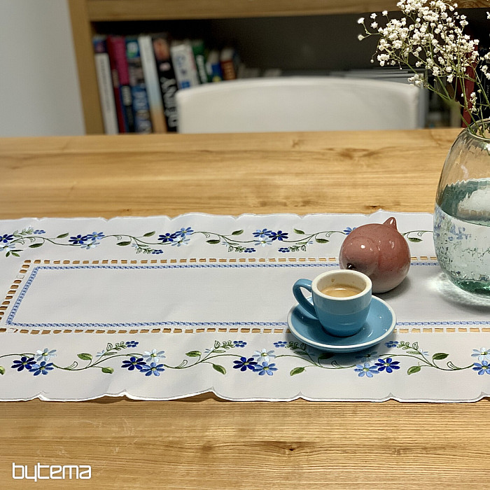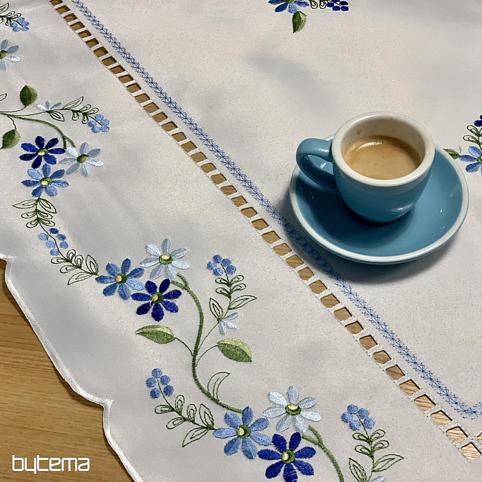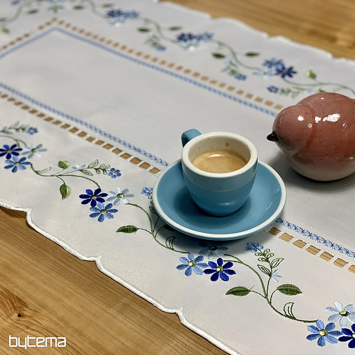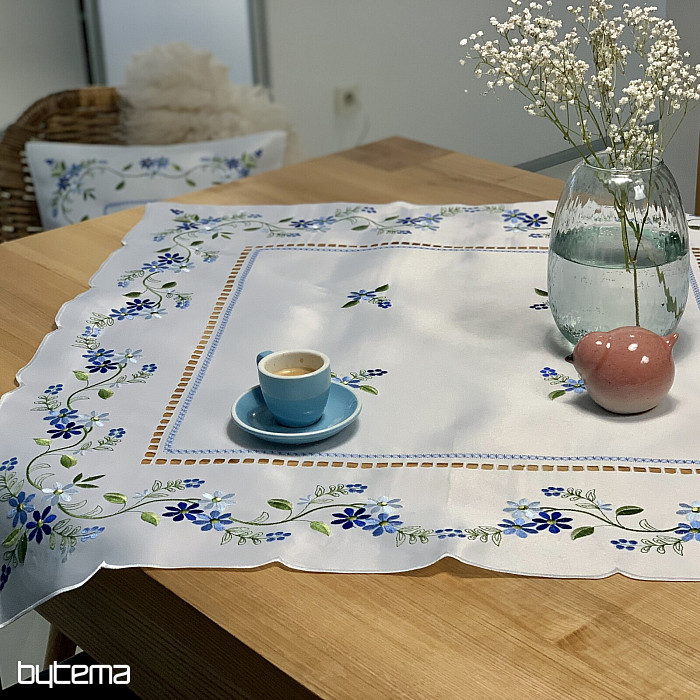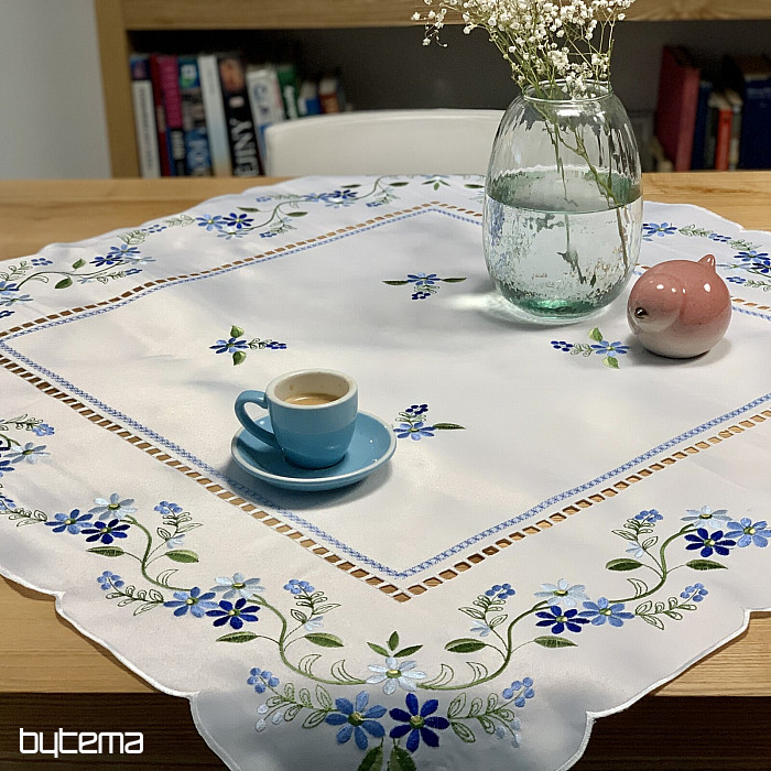 Nappe et foulard délicatement brodés à motif de myosotis.