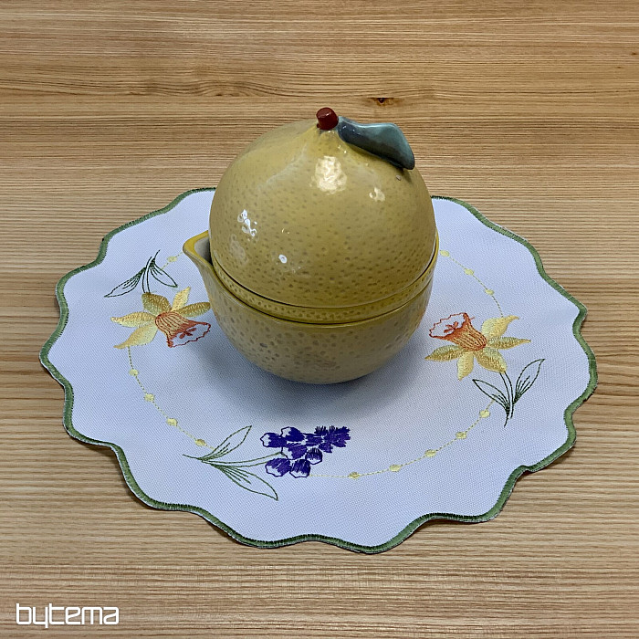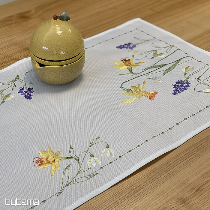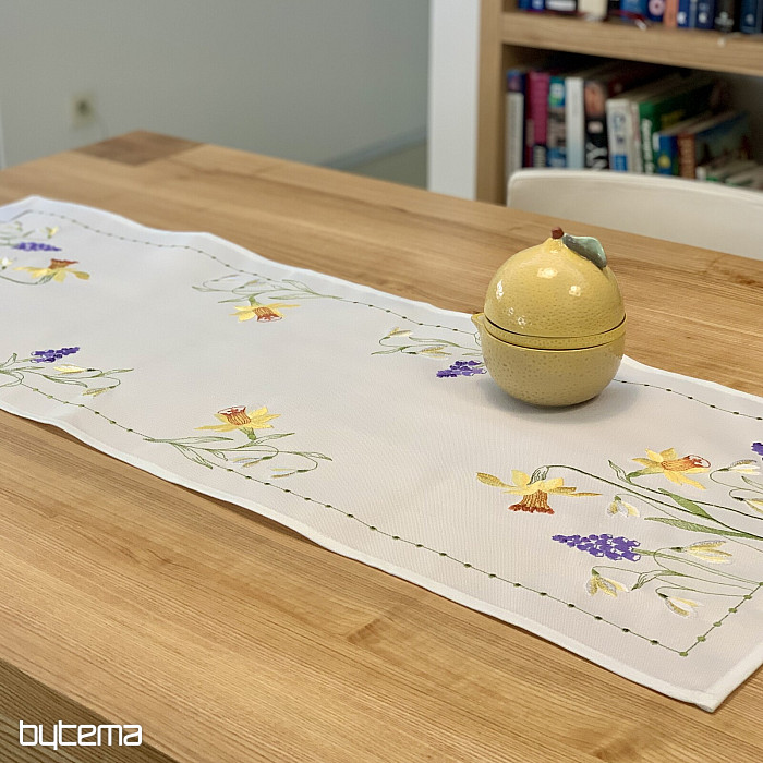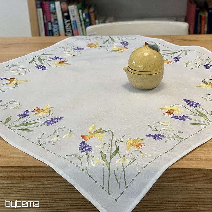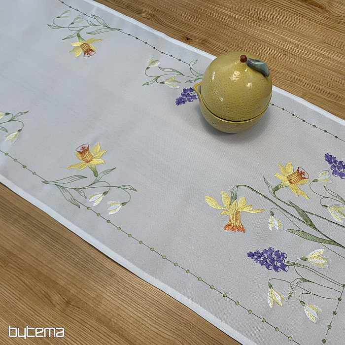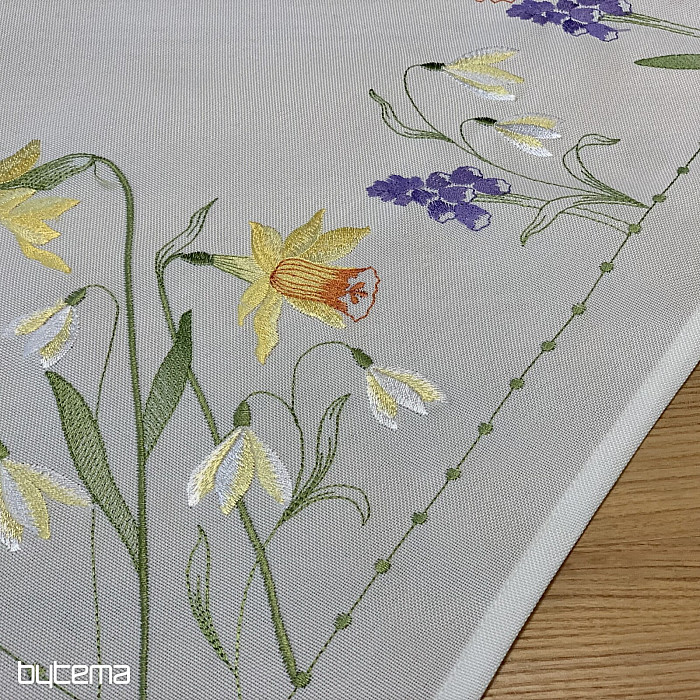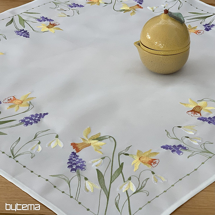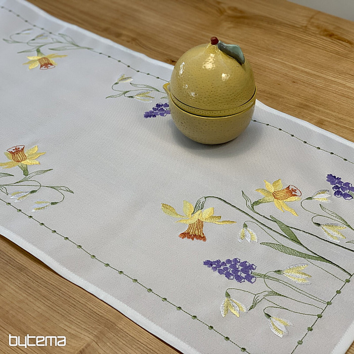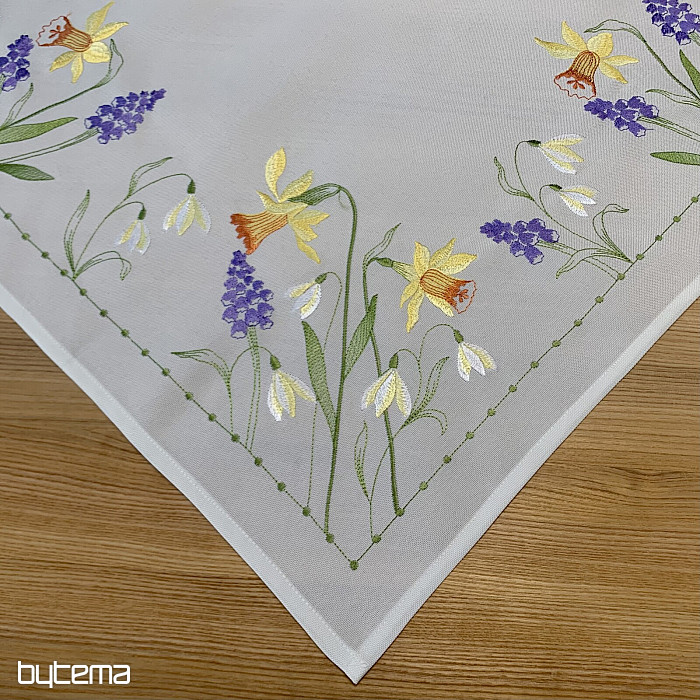 Nappe et foulard brodés à motif de jonquilles, de perce-neige et de mûres, un motif printanier indémodable.