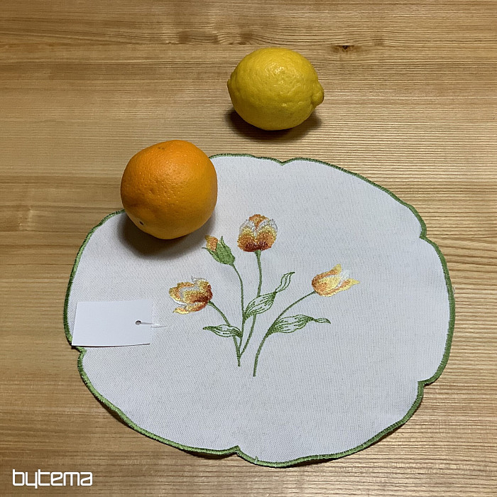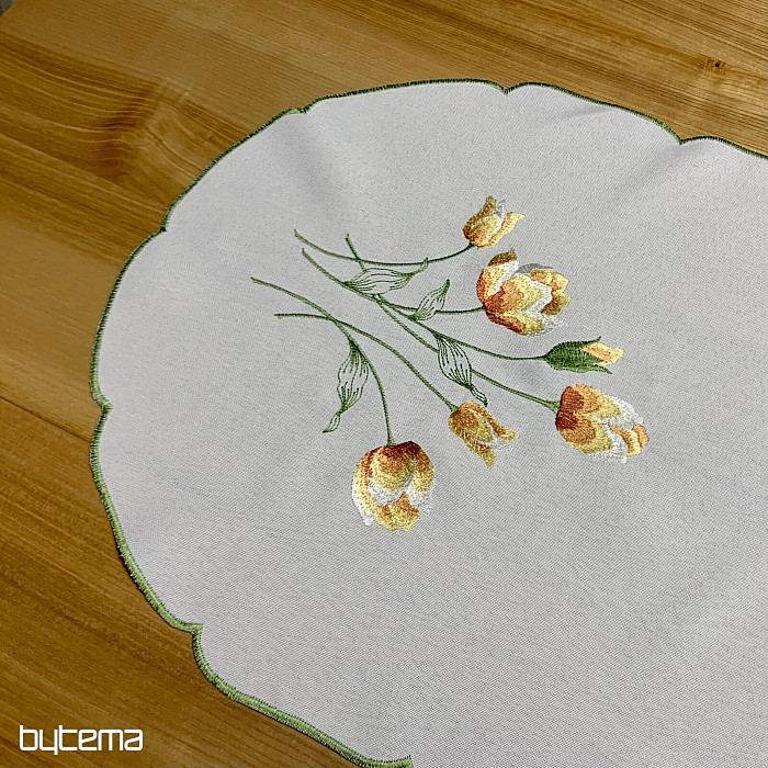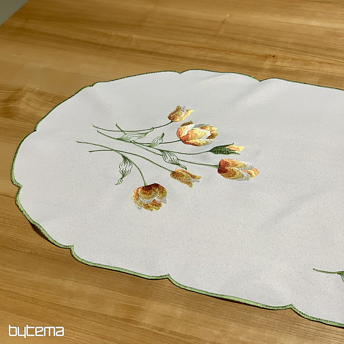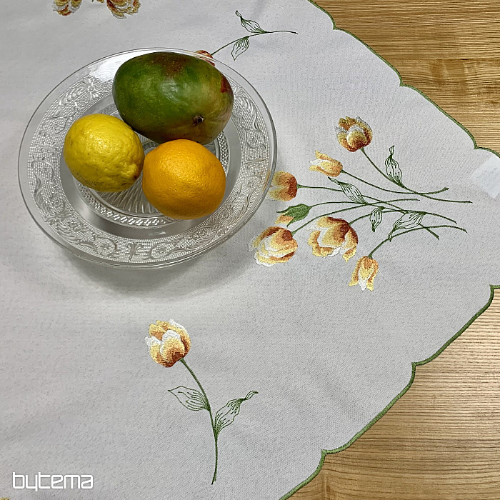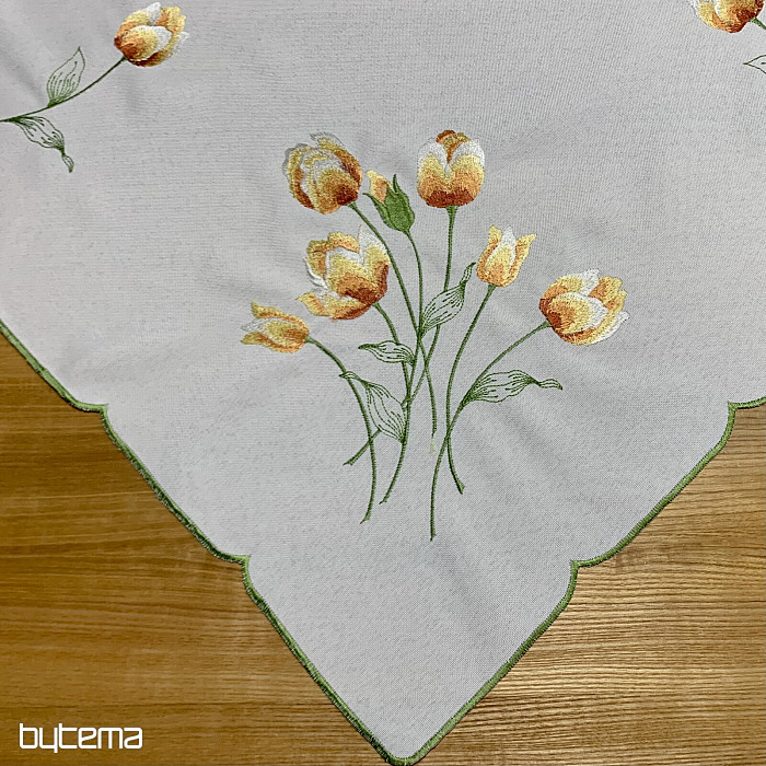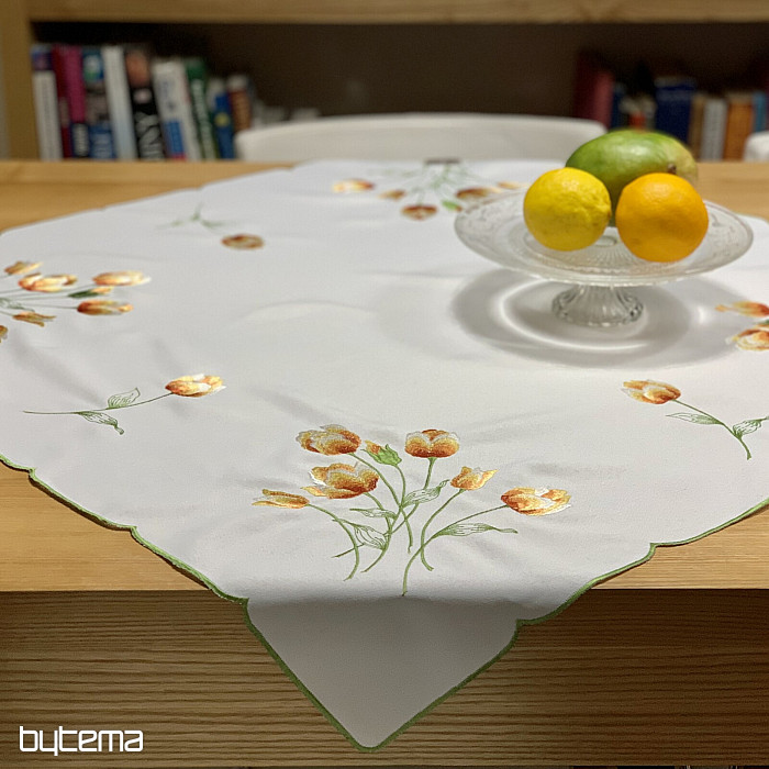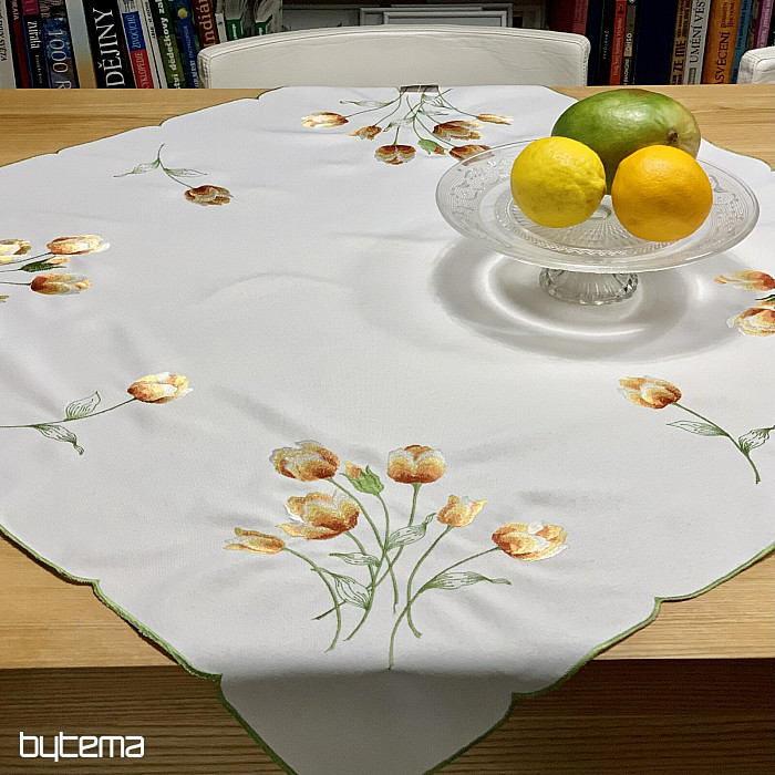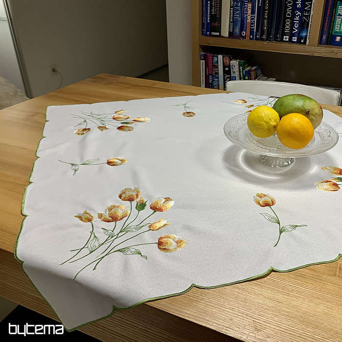 Nappe et foulard brodés à motif de tulipes orange, une magnifique broderie représentant les fleurs printanières les plus appréciées.
