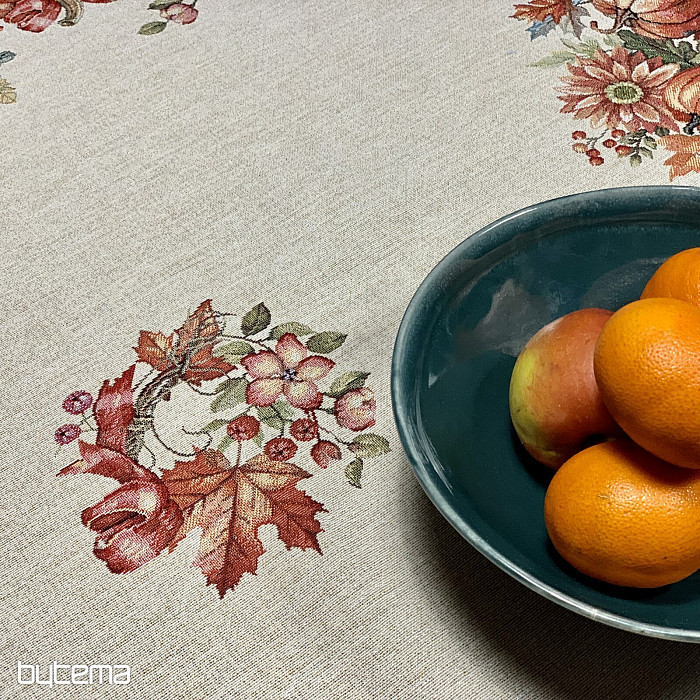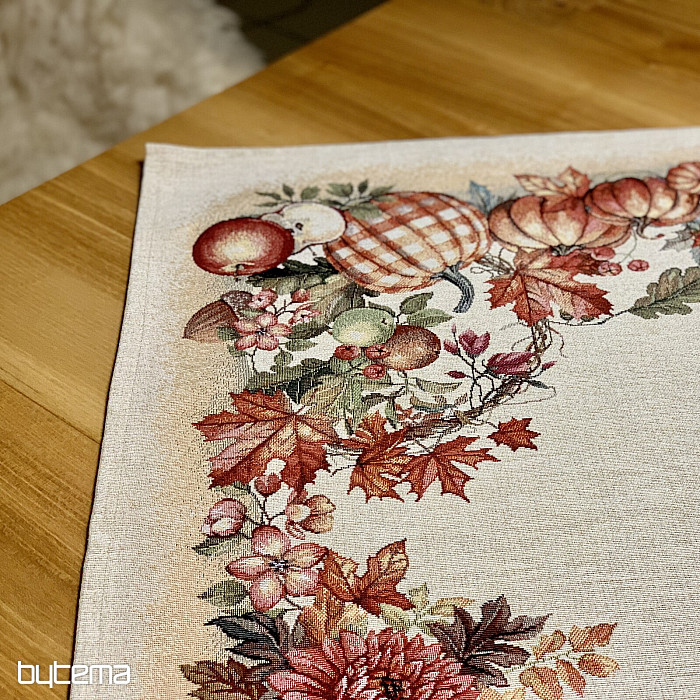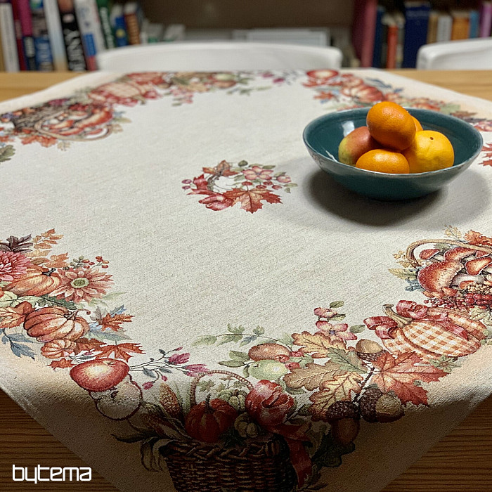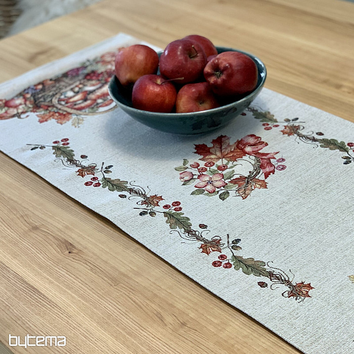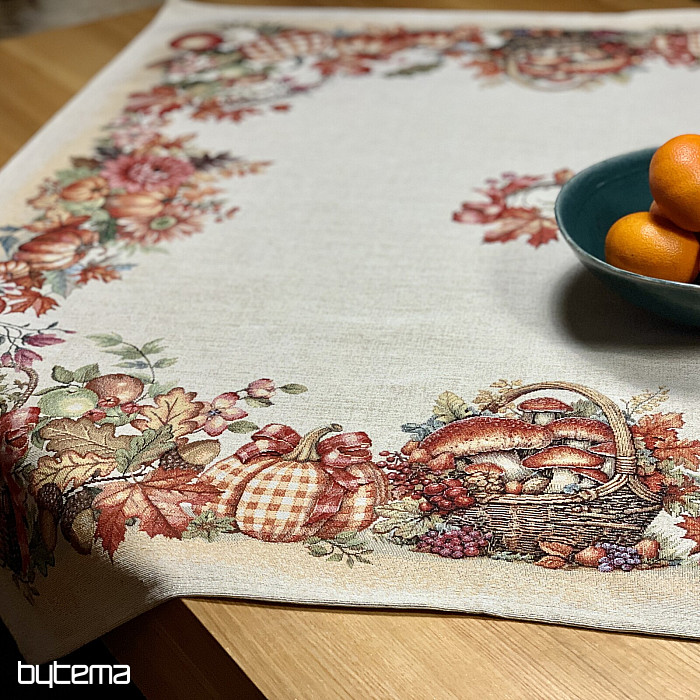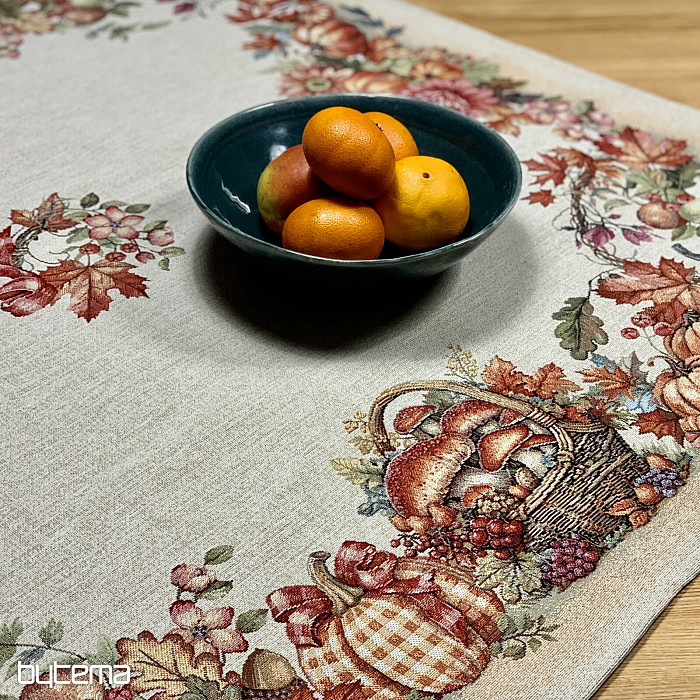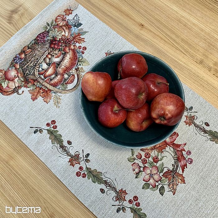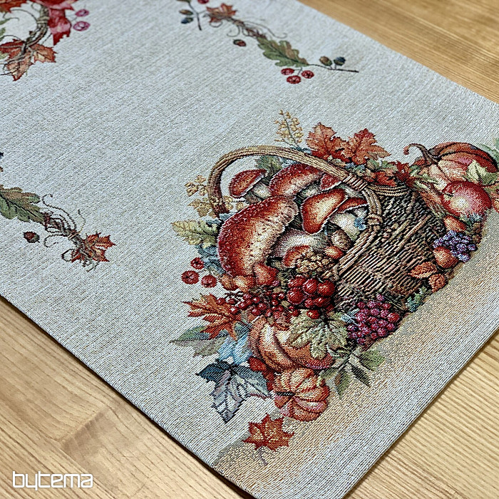 Une nappe et un foulard en tapisserie à motifs de fruits et de champignons créeront une ambiance agréable.