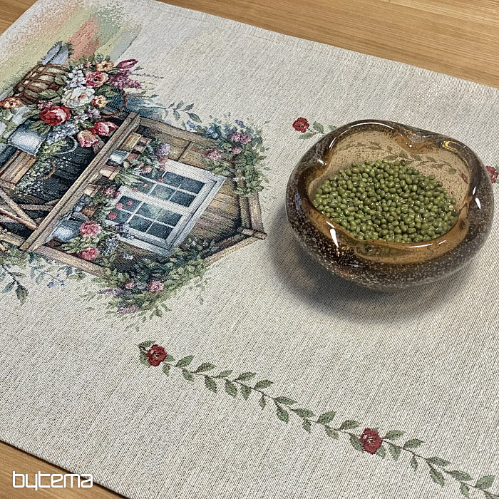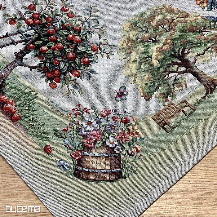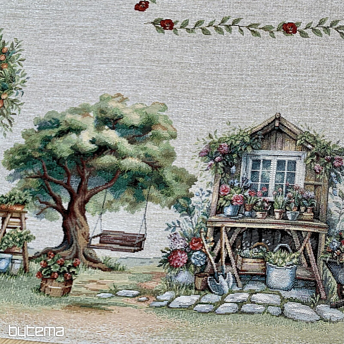 Une nappe et une écharpe en tapisserie ornées d'une maison de jardin fleurie. Au premier coup d'œil, le motif évoque le confort et la chaleur du printemps.