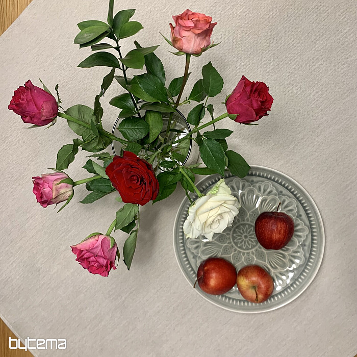 La nappe et l'écharpe sont confectionnées dans un tissu tapisserie uni, épais et de haute qualité. Vous pouvez les assortir à votre guise.