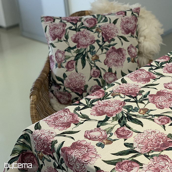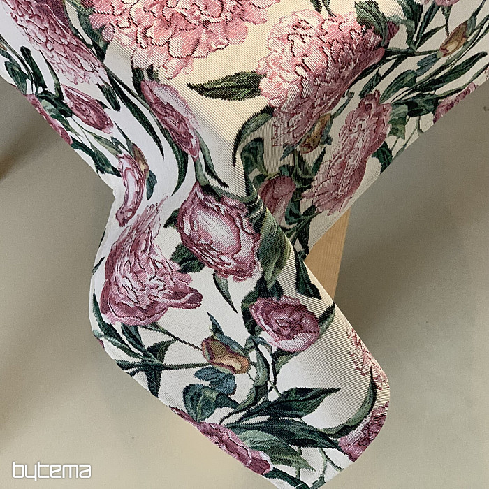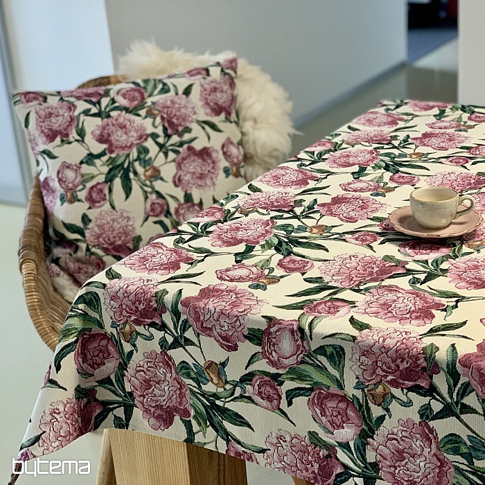 Une magnifique nappe ou un foulard en tapisserie orné de grandes pivoines roses, posé sur votre table. Une décoration délicate et romantique qui apportera confort et sérénité à votre intérieur.