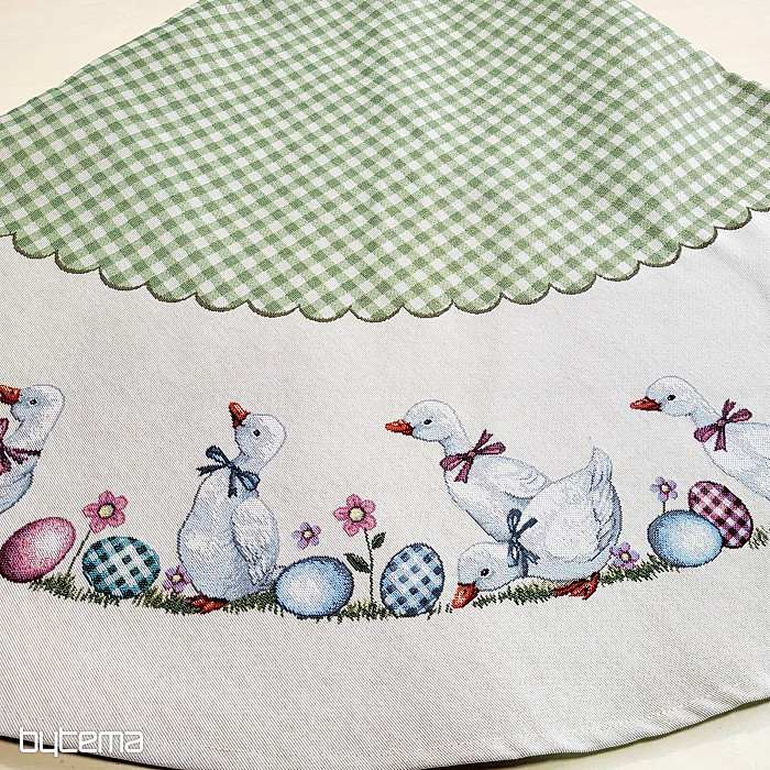 Nappe ronde à carreaux verts et motifs d'oies, inspirée de Pâques. Une magnifique décoration pour votre table ronde.