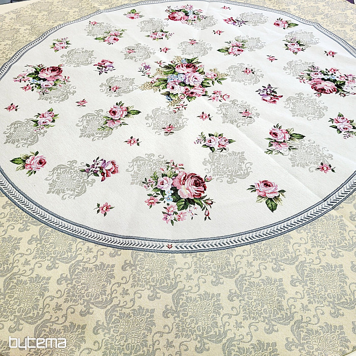 Nous vous présentons un nouveau modèle inspiré des châteaux : une nappe élégante et raffinée ornée de roses et de rosettes romantiques.