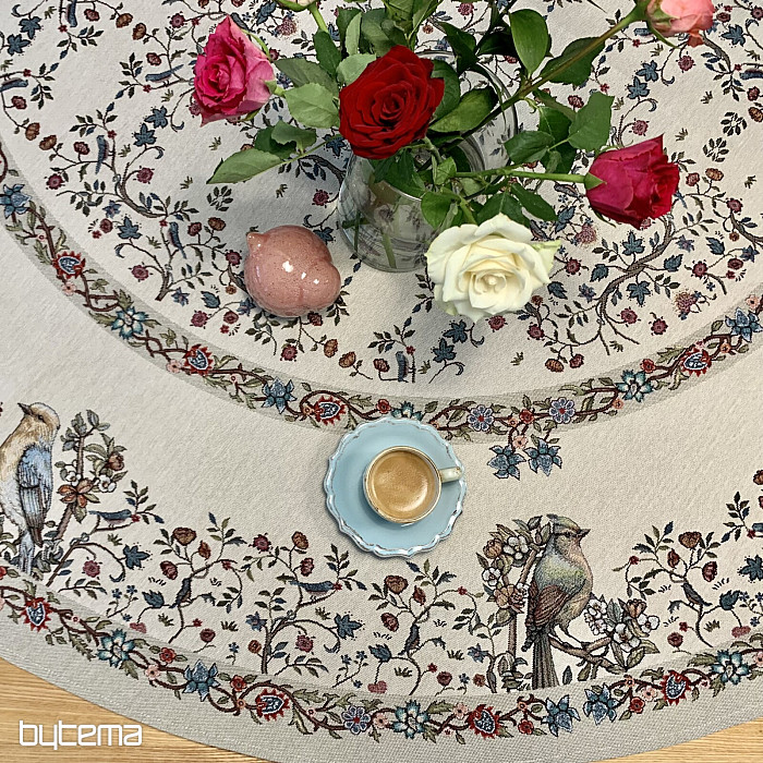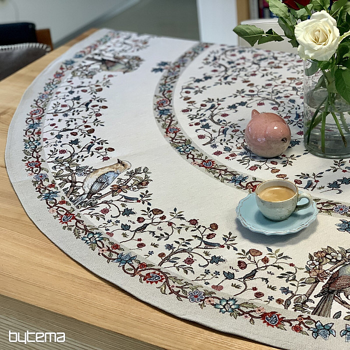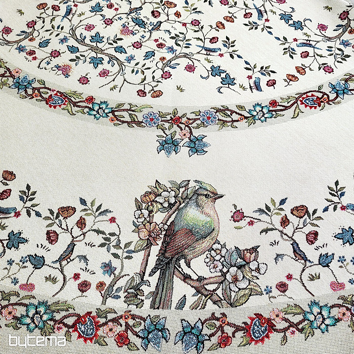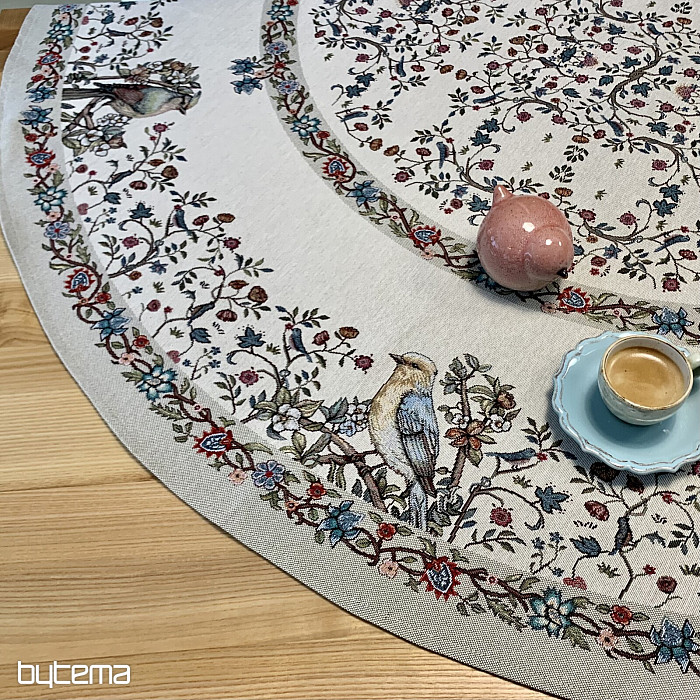 Une magnifique nappe ronde en tapisserie robuste ornée d'oiseaux et de fleurs aux couleurs variées. Un accessoire ou un cadeau idéal pour les amoureux des oiseaux.