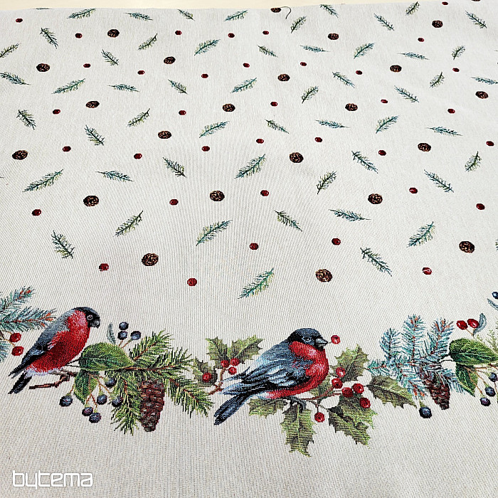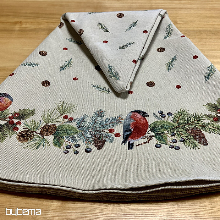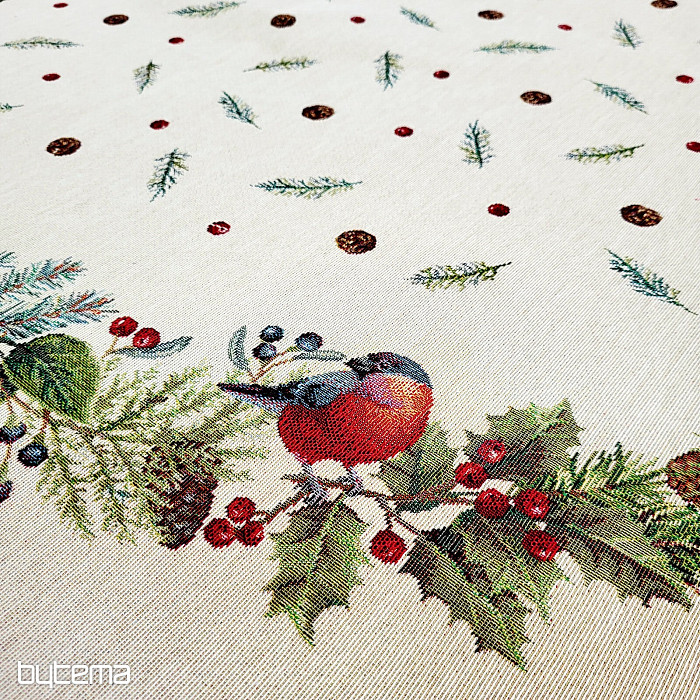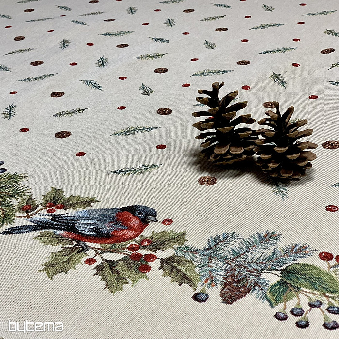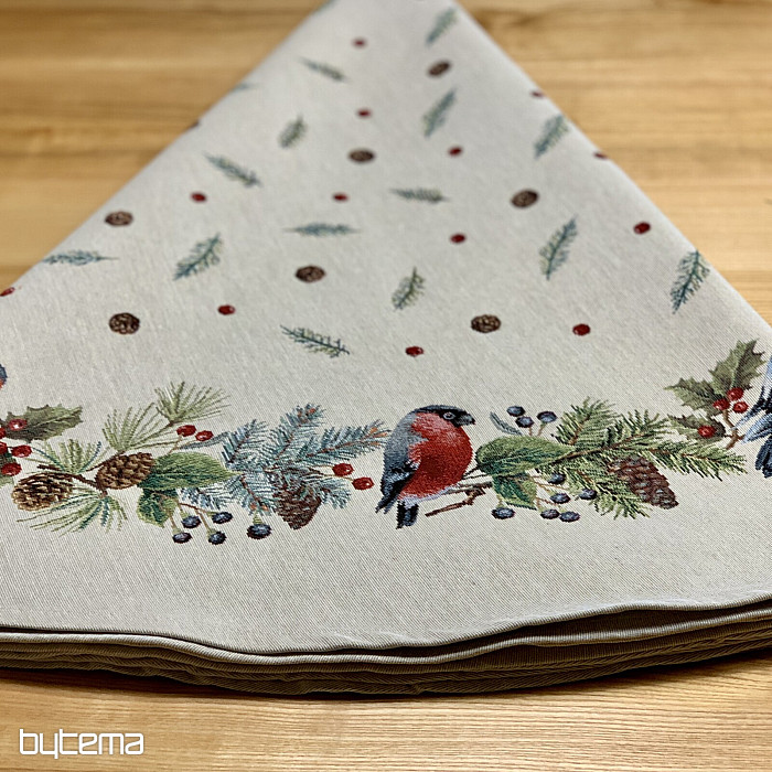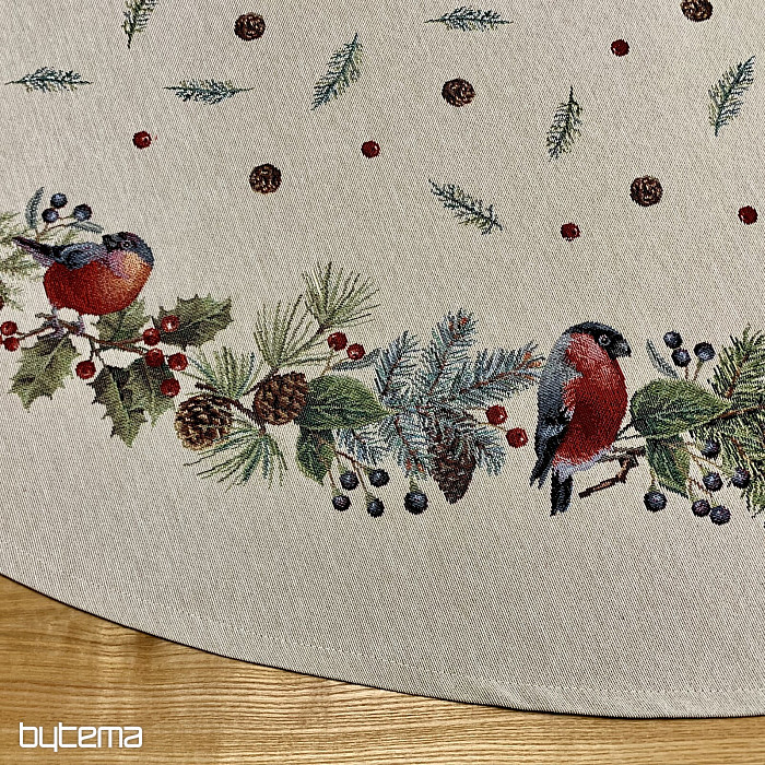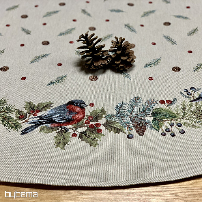 Nappe ronde de Noël en tissu tapisserie ornée d'un motif d'oiseau d'hiver : un bouvreuil. N'hésitez pas à utiliser cette nappe comme décoration pour les fêtes de fin d'année.