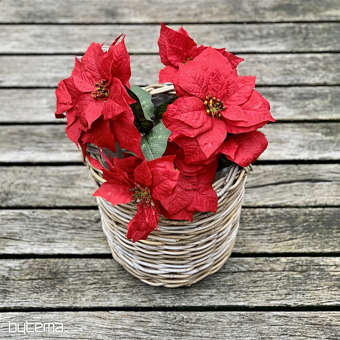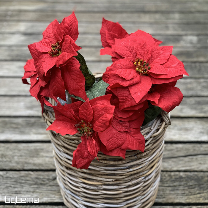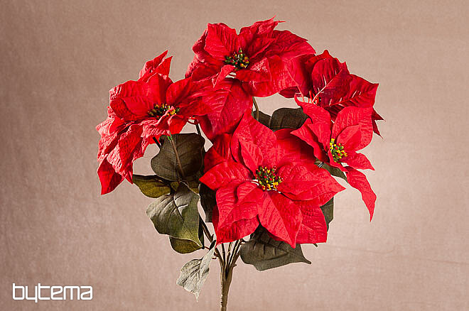 Un grand bouquet de fleurs rouges au design réussi. Composé de sept fleurs et de nombreuses feuilles, ce bouquet généreux est très naturel et sa beauté fera une décoration impressionnante pour Noël.