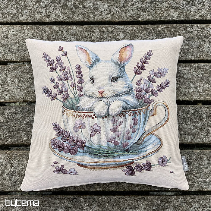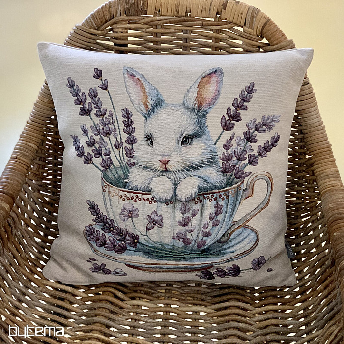 Taie d'oreiller en tapisserie ornée d'un adorable lapin dans un service en porcelaine, entourée de lavande parfumée. Une décoration belle et délicate, parfaite pour toutes les occasions, pas seulement à Pâques.