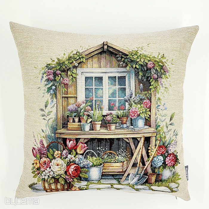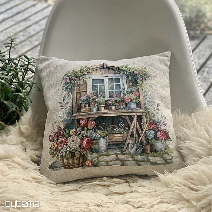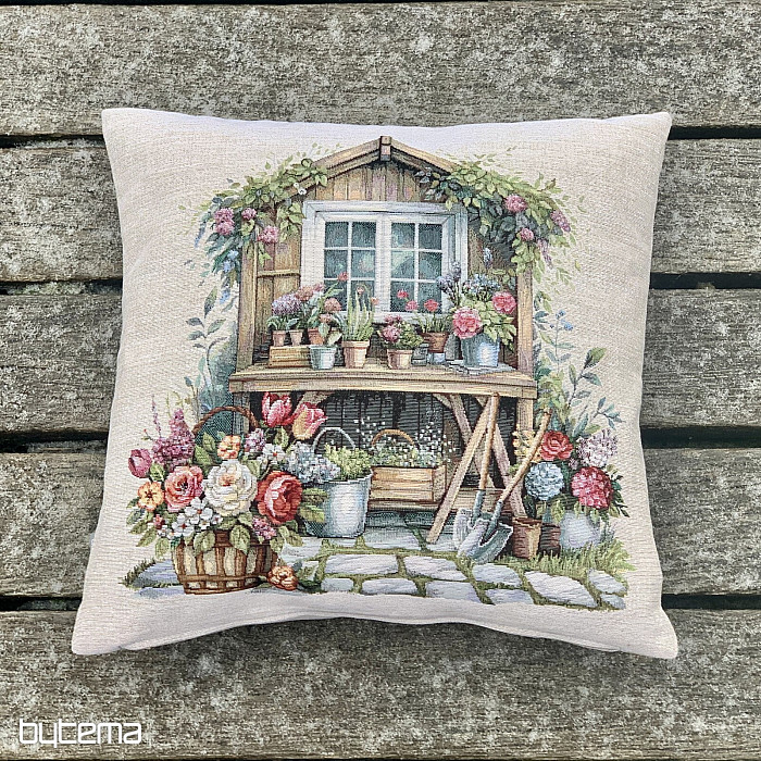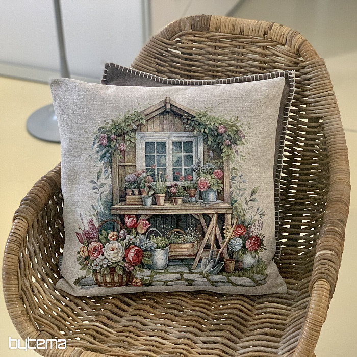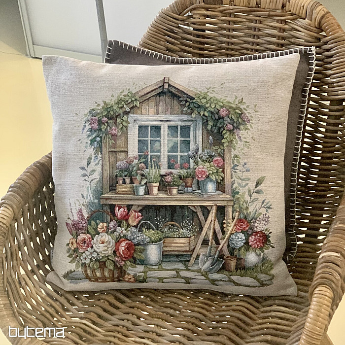 Taie d'oreiller en tapisserie ornée d'une maison de jardin fleurie. Le motif évoque le confort et la chaleur du printemps.
