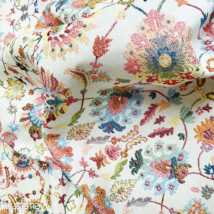 Notre nouveauté en magasin est un tissu de tapisserie orné de fleurs indiennes distinctives qui créent des ornements intéressants.