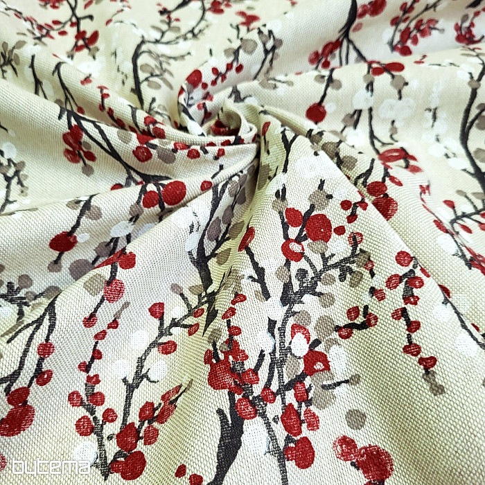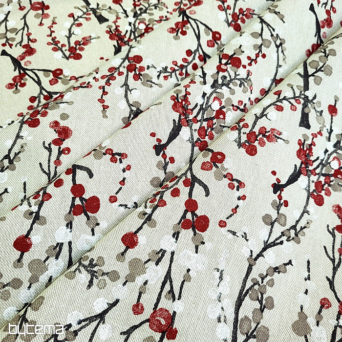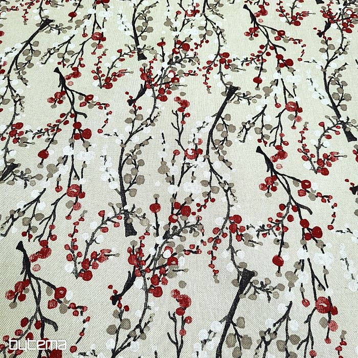 Tissu décoratif à motifs d'arbres et de bulles rouge-gris imitant la neige ou les fleurs.