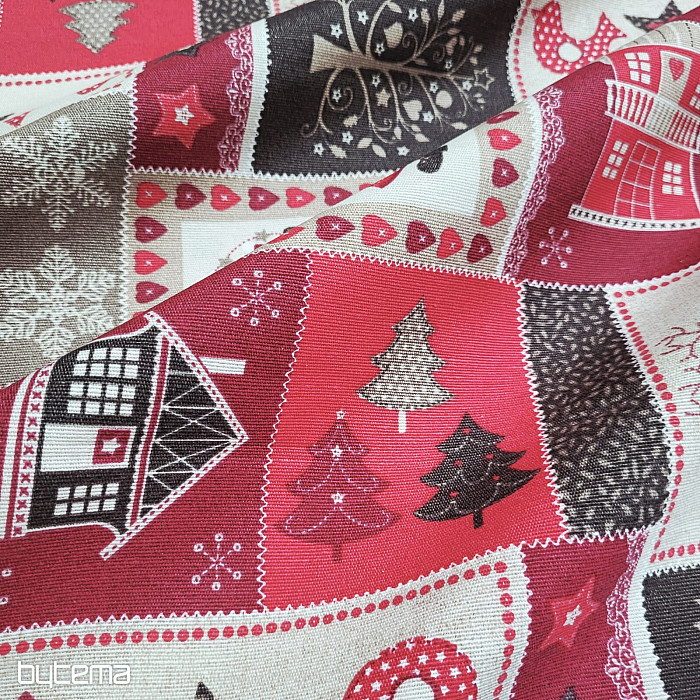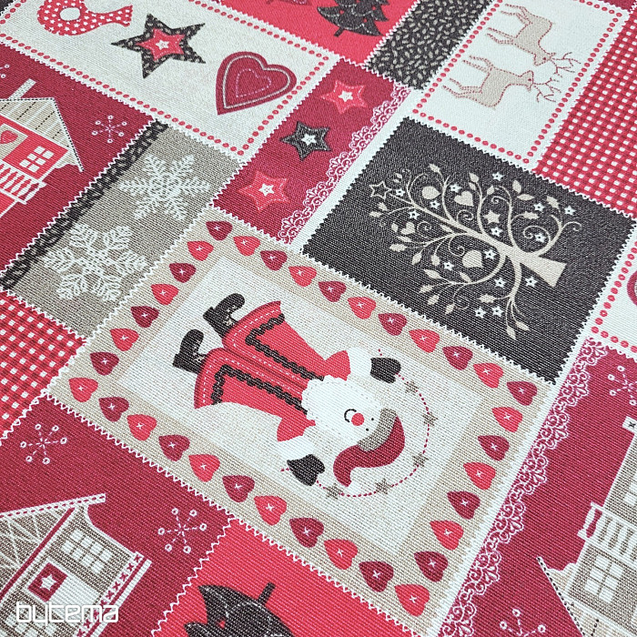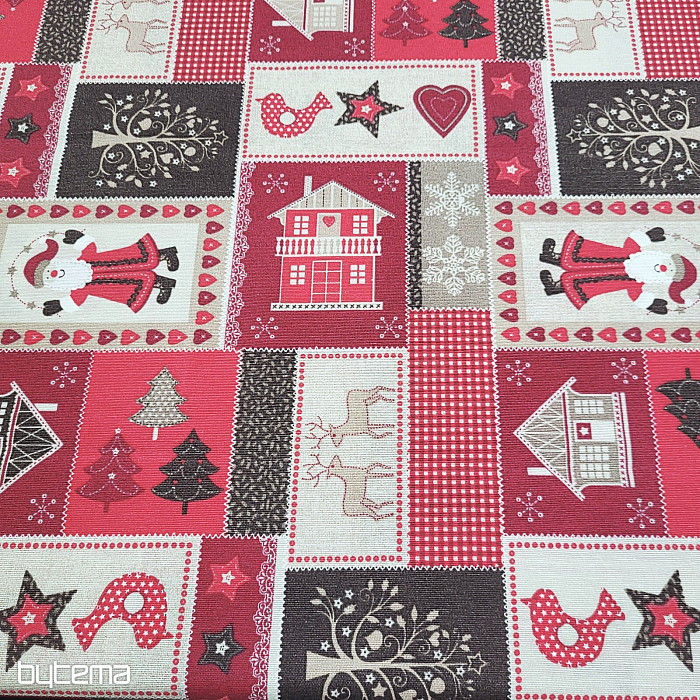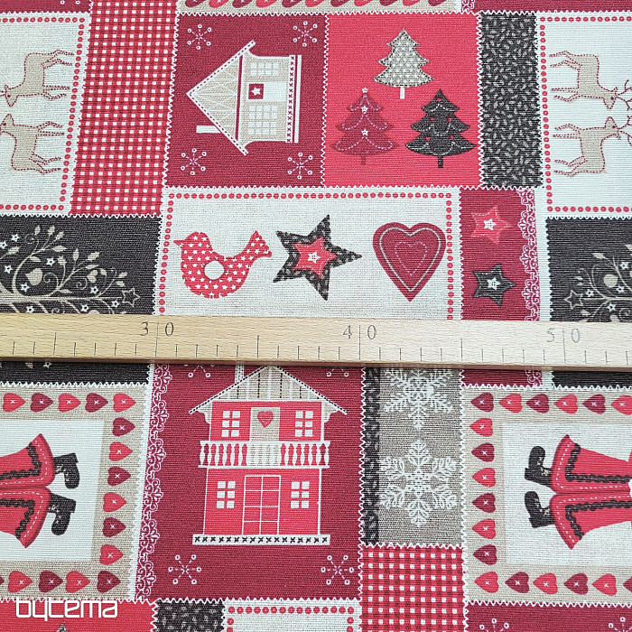 Tissu décoratif à motif patchwork de Noël, idéal pour les intérieurs de style rustique et champêtre.