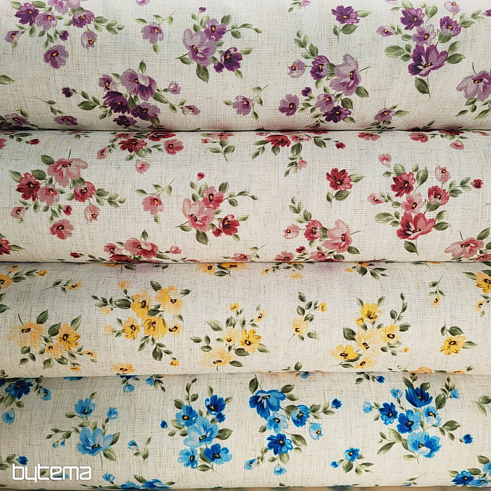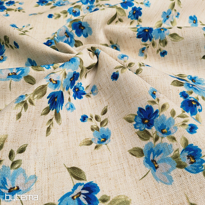 Un tissu décoratif à motifs de fleurs printanières dans un bleu myosotis embellira votre cuisine et votre pergola.