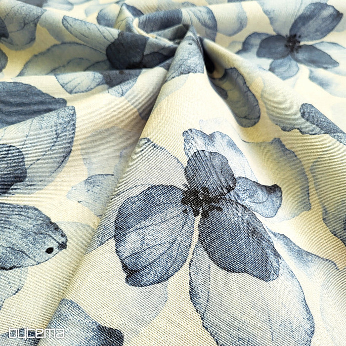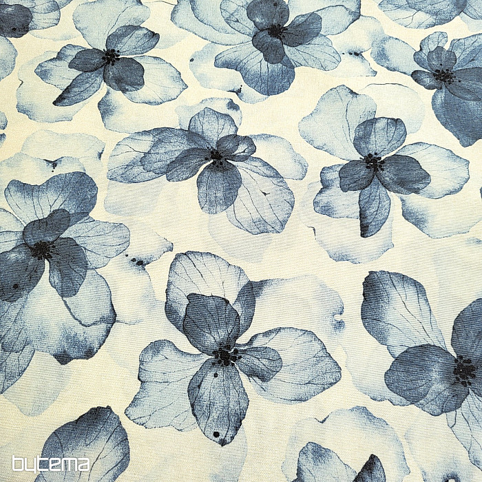 Tissu décoratif à grandes fleurs dans les tons de bleu.