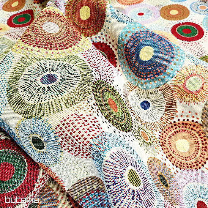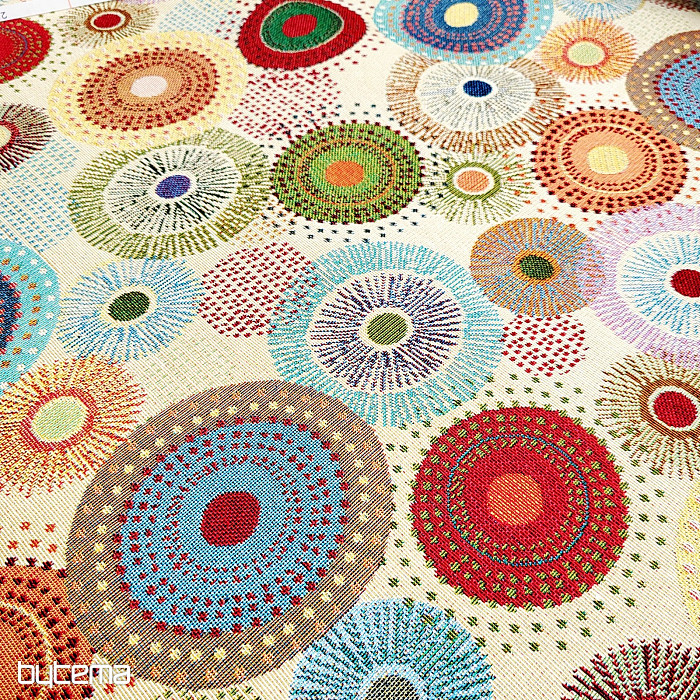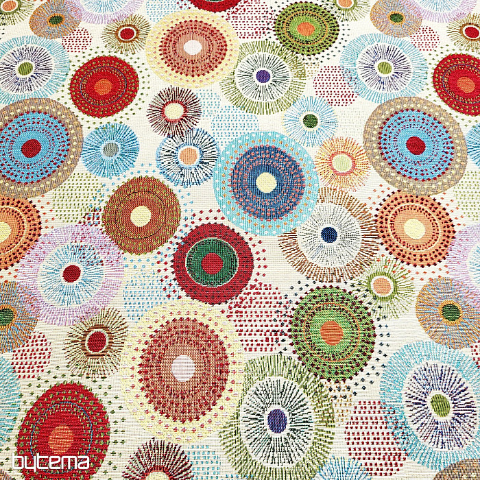 Notre nouveauté en boutique est un tissu de tapisserie orné de mandalas colorés. Ses couleurs subtiles mais éclatantes lui confèrent une grande élégance.