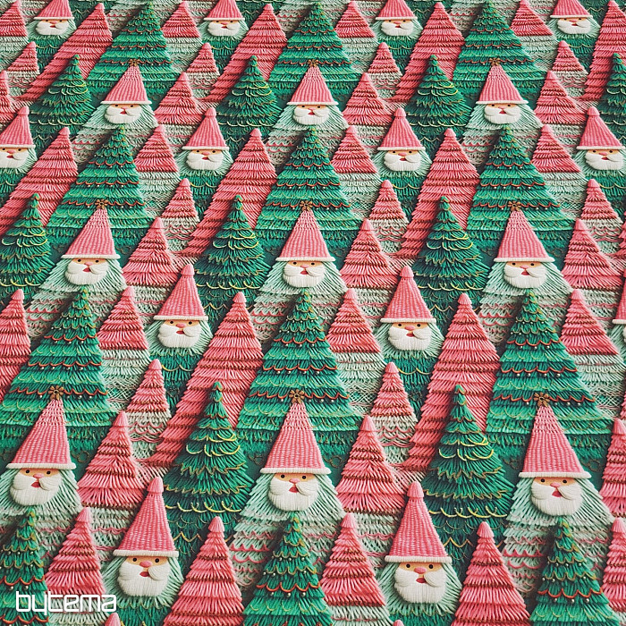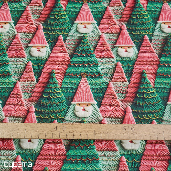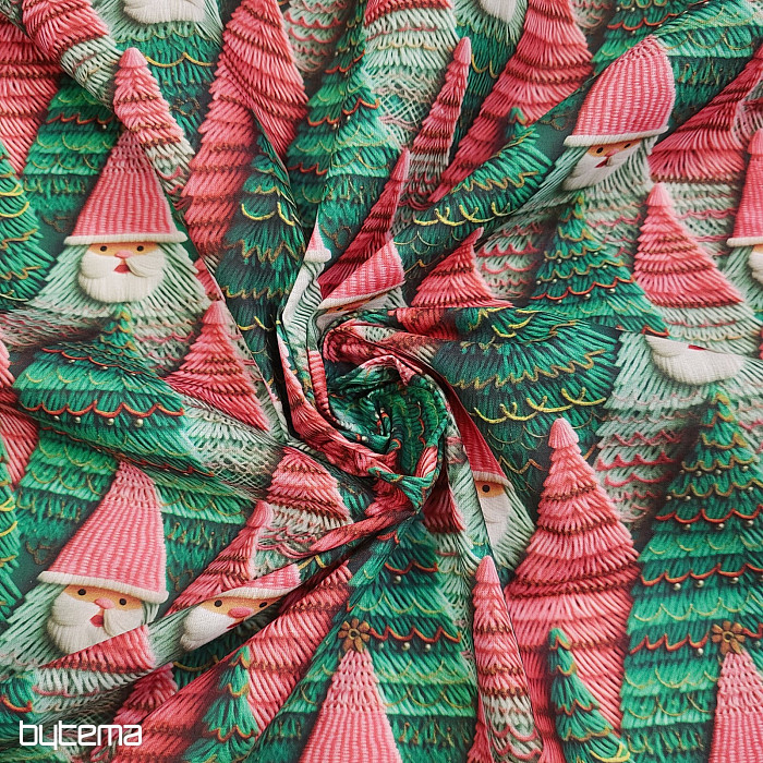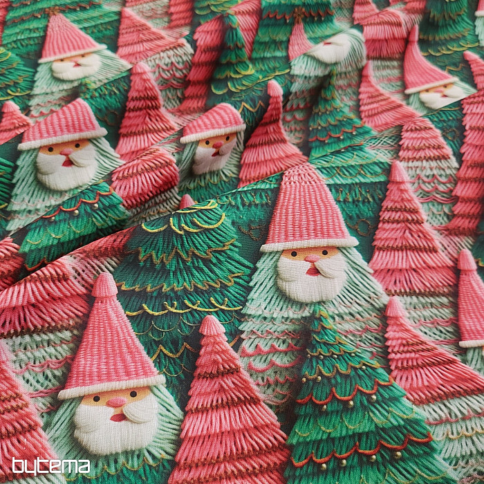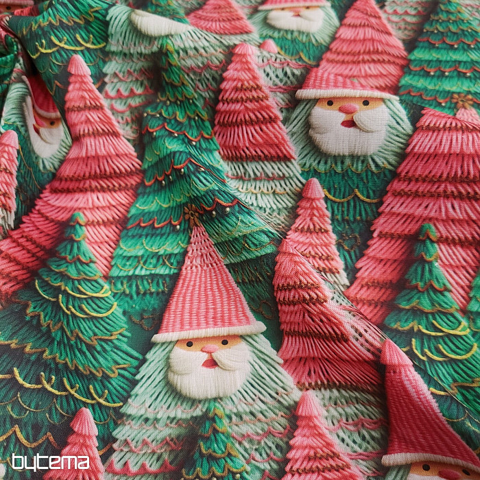 Tissu décoratif de Noël orné du visage adorable du lutin Arthur perdu dans la forêt. Ce tissu convient à la confection de nappes, rideaux et taies d'oreiller.